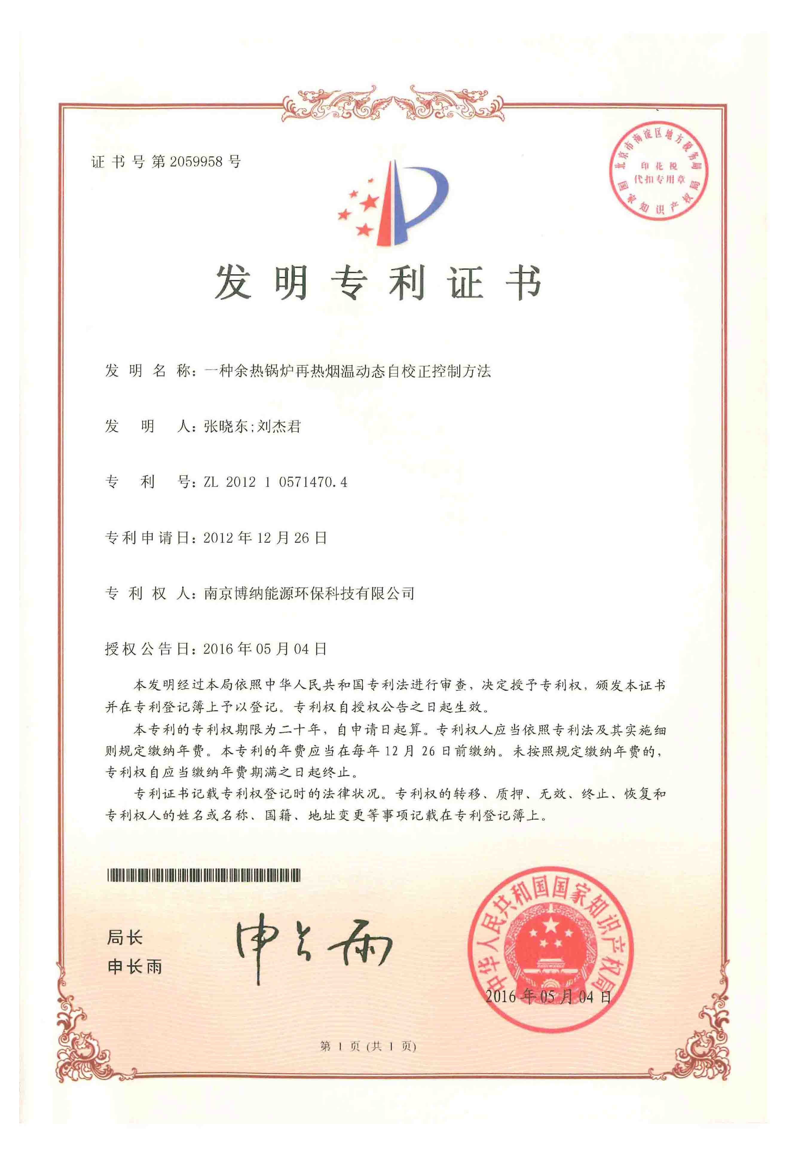 我公司提出的“一種余熱鍋爐再熱煙溫動態(tài)自校正控制方法”發(fā)明專利于2016年5月份獲得國家知識產(chǎn)權(quán)局授權(quán)并頒發(fā)專利證書。